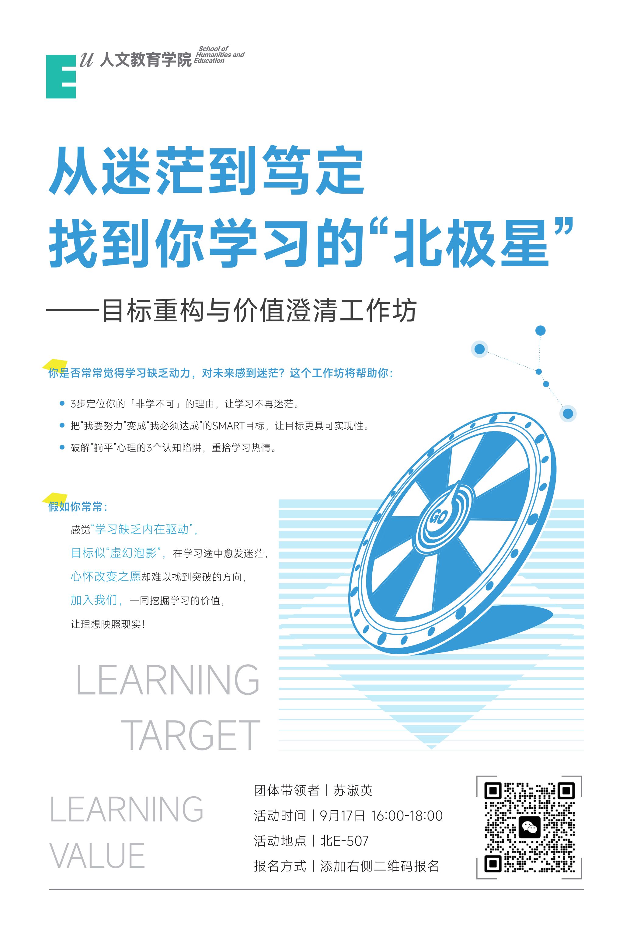 9月17日16:00-18:00,两场特色工作坊同步开启。在北E-507教室,由苏淑英老师带领的“目标重构与价值澄清工作坊”成为学子们的“迷茫破解站”。工作坊通过“3步定位非学不可的理由”环节,帮助学生深挖学习内在驱动力,将模糊的“我要努力”转化为可落地的SMART目标;同时,针对“躺平”心理,老师拆解3个认知陷阱,用案例分析与互动讨论,让学生重新点燃学习热情。来自工商管理学院的同学表示:“之前总觉得学习没方向,现在终于找到‘非学不可’的理由,目标也清晰多了。”