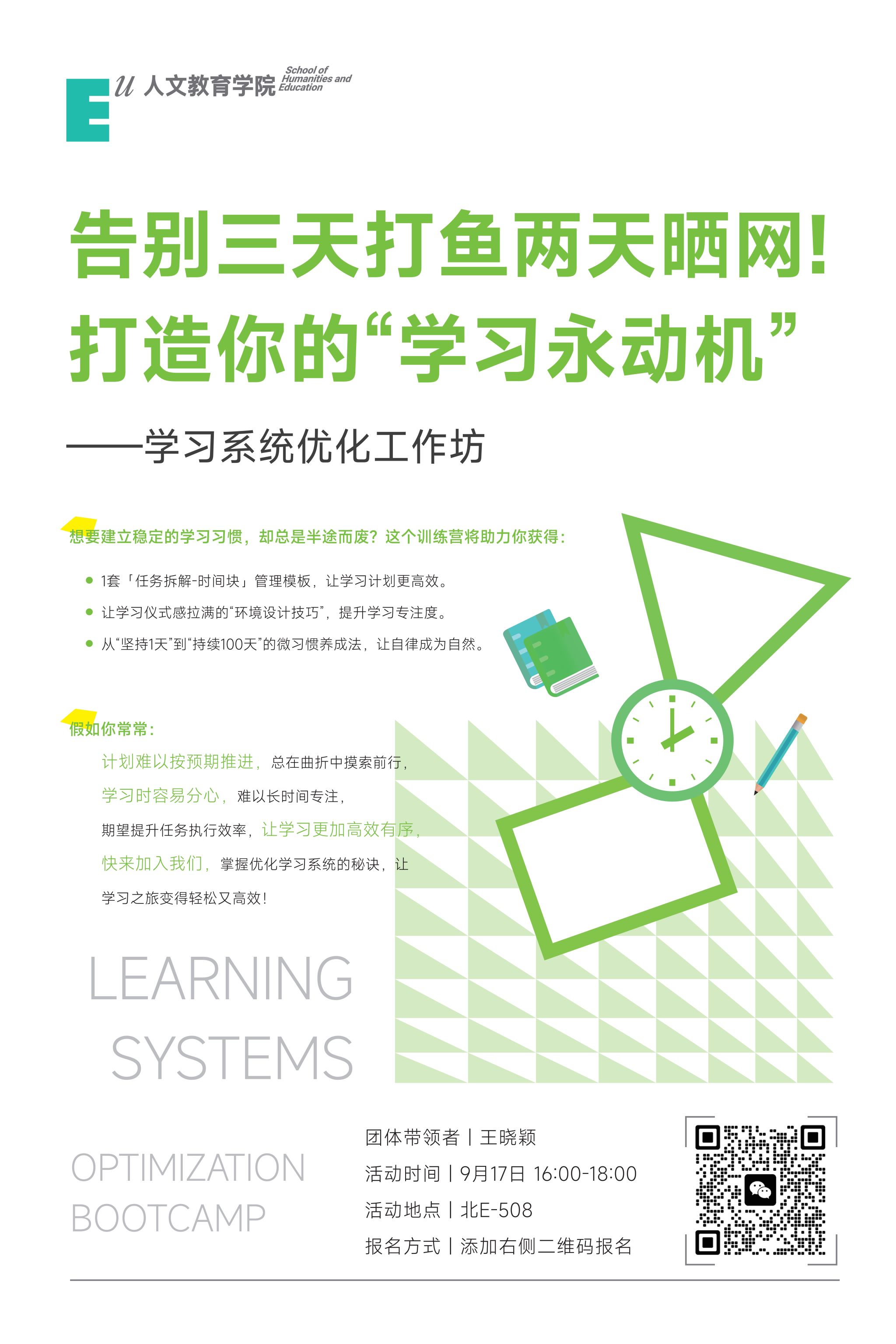 同一时间段,北E-508教室的“学习系统优化工作坊”则聚焦“高效学习”。王晓颖老师带来的“任务拆解-时间块”管理模板,让不少学生直呼“实用”。工作坊中,老师不仅分享了提升专注度的“学习环境设计技巧”,还详细讲解了从“坚持1天”到“持续100天”的微习惯养成法。职业教育学院的一名学生坦言:“以前制定的学习计划总半途而废,这次学到的模板和技巧,能帮我把计划落实到每天,太有收获了。”
