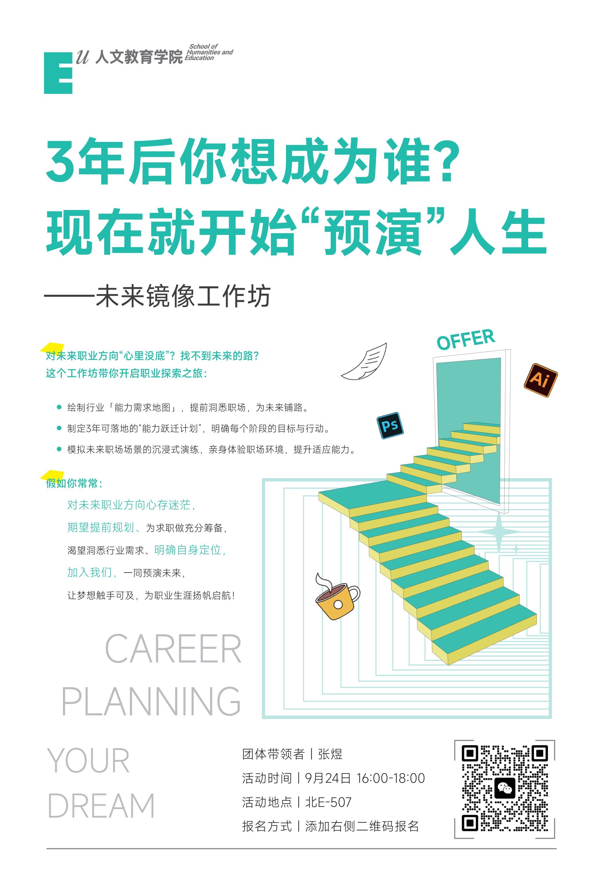 9月24日16:00-18:00,另外两场工作坊接力开讲,聚焦职业规划与毅力培养。北E-507教室的“未来镜像工作坊”由张煜老师主持,带领学生开启“职业预演”。通过绘制行业“能力需求地图”,学生们提前洞悉职场所需技能;“3年能力跃迁计划”的制定环节,让大家明确了不同阶段的目标与行动方向;而沉浸式职场场景模拟,更让学生亲身体验职场环境,提升适应能力。“之前对未来职业一片迷茫,现在知道该朝着哪些方向提升自己了。”文化传媒学院的同学在参与后说道。